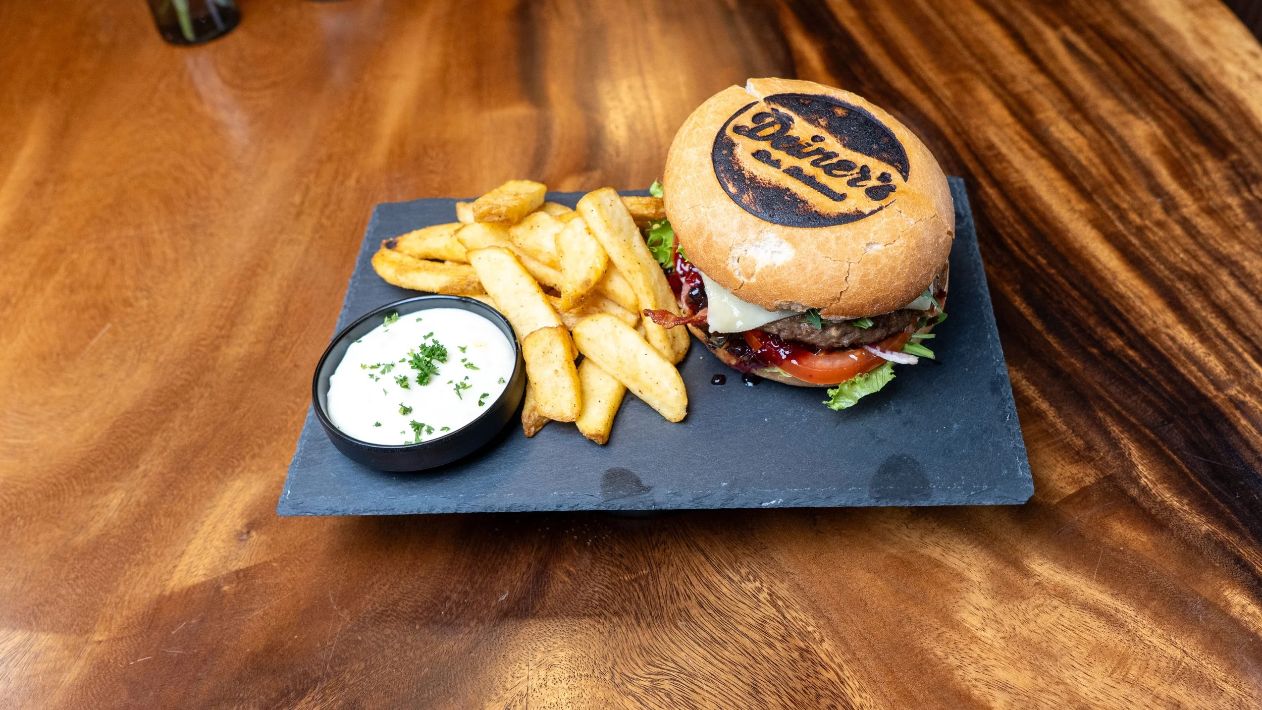 Rindfleisch, Weizenbrötchen ,Frischkäse, Gurken Relish, Zwiebel-Beeren-Marmelade, Salat, Essiggurke, Gouda, Bacon, Tomaten,Pommes frites und hausgemachter Aioli