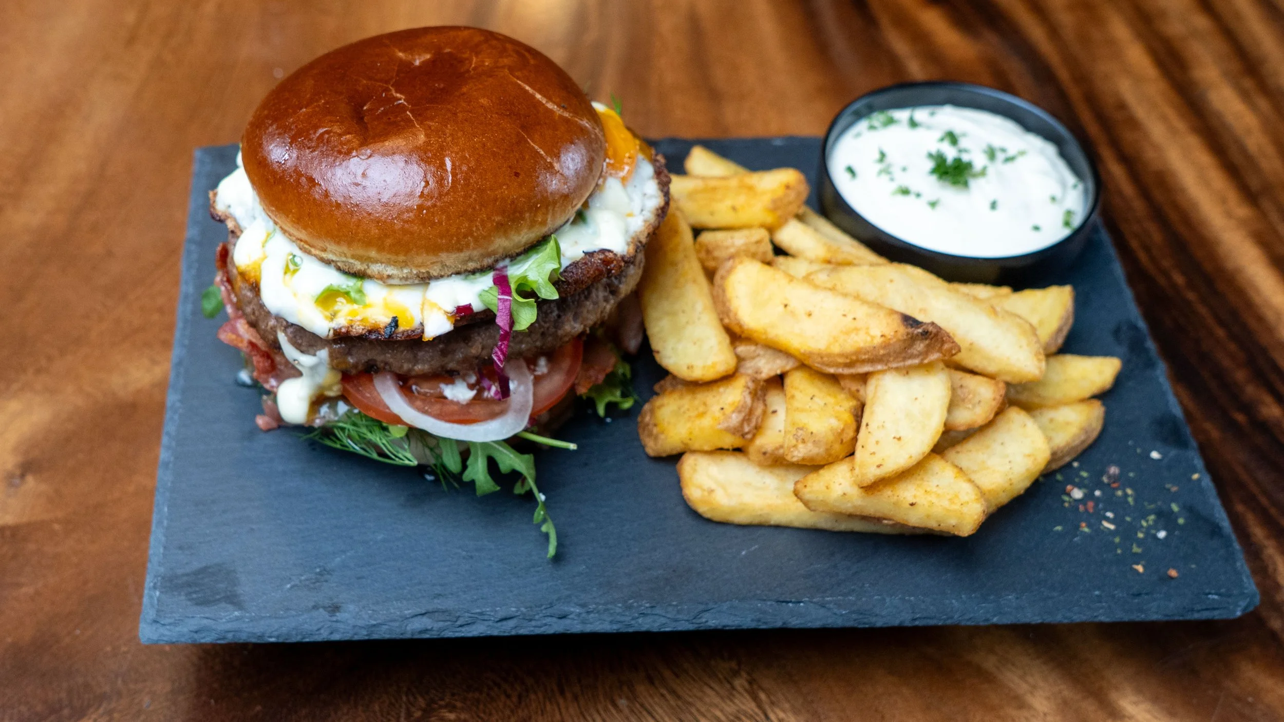 Vom regionalen Eifelrind, dazu servieren wir Pommes frites, Perlzwiebel-Speck-Rahm und einen saisonalen Kräutersalat mit unserem Hausdressing